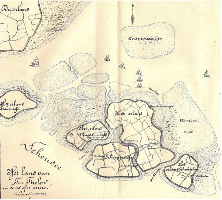 Omstreeks de 10e of 11e eeuw bestond het voormalige eiland Tholen uit een vier- of vijftal kleine eilandjes die van elkaar werden gescheiden door kreken en geulen in een uitgestrekt schorrengebied. Aangenomen mag worden dat de eilandjes zijn ontstaan als een spontaan uit de zee ge-groeid (opwassend) schor-gebied dat van alle zijden door het water werd om-spoeld.