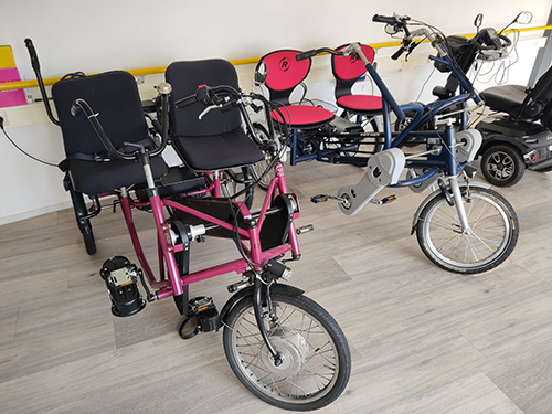 Ook hebben we de beschikking over twee TV-fietsen (om virtueel te fietsen vanuit uw stoel) en twee duo-fietsen waarmee u, met een vrijwilliger, er echt op uit kan.